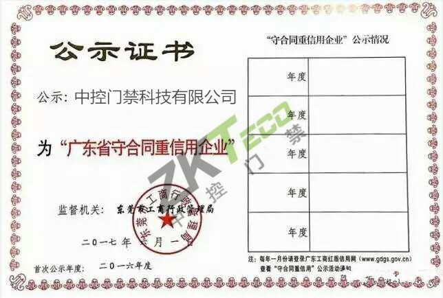 近日,廣東省工商行政管理局公布“2016年度廣東省守合同重信用企業”公示名單。中控門禁科技有限公司(以下簡稱“中控門禁”)秉承誠信經營的理念,不遺余力地推動企業誠信體系建設,積極打造企業內部良好的信用環境,被評為“守合同重信用”企業。