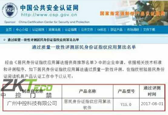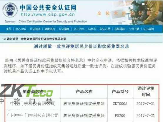 中控門禁“居民身份證指紋算法及采集器”通過公安部認證
